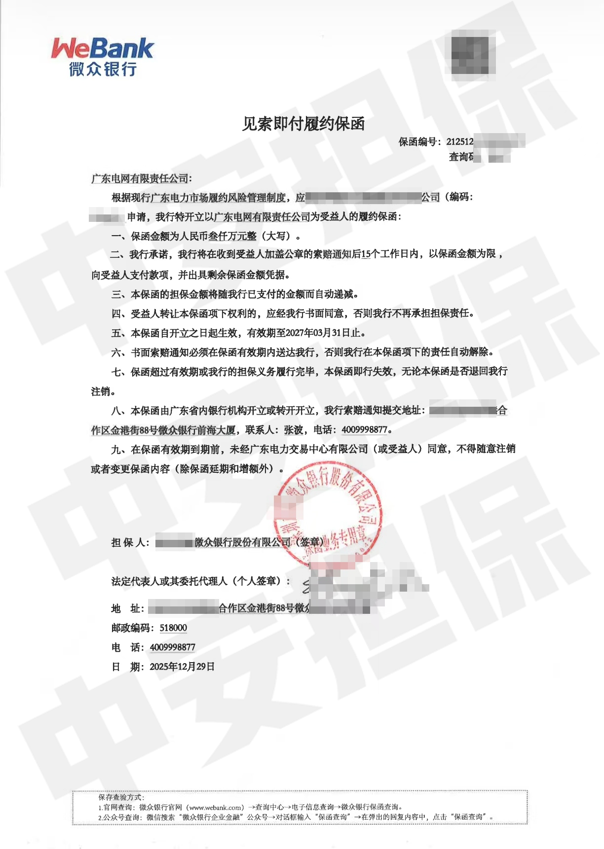 应能源技术公司业务发展需求,需向广东电网有限责任公司开立一笔三千万元高额售电履约保函,并由微众银行出具。