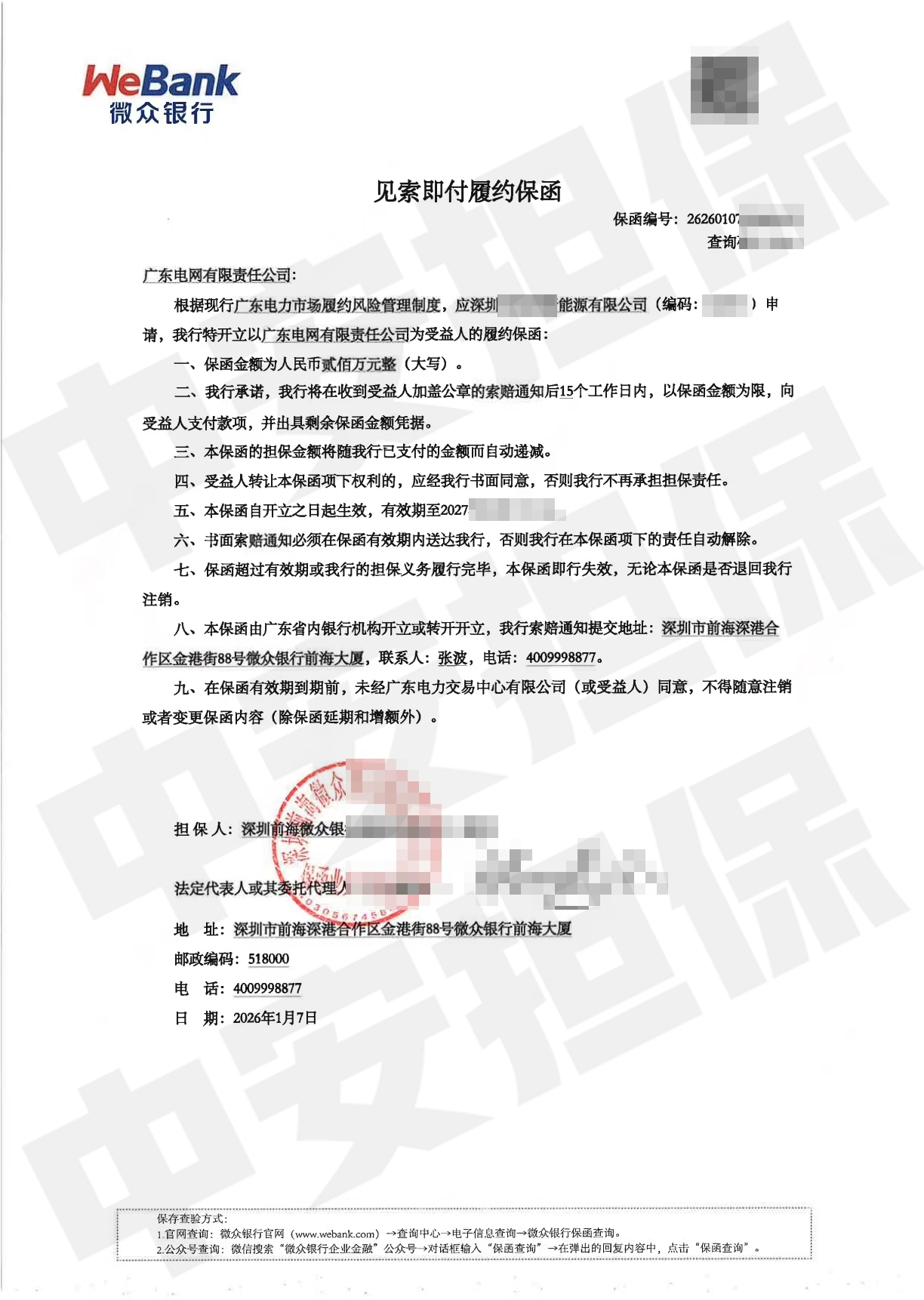 应深圳能源公司业务发展需求,微众银行快速向广东电网开立200万元增额售电履约保函;